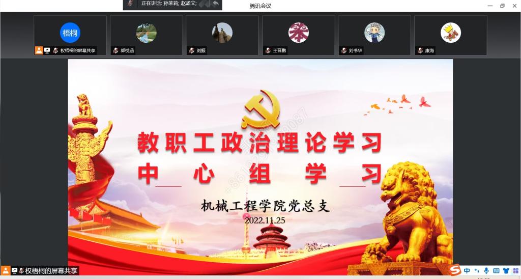 11月25日,beat365英国官网网站党总支召开11月中心组学习会议,会议采用线上方式进行。会议由孙茉莉书记主持。beat365英国官网网站党总支中心组成员参加会议。会议主要学习了《习近平总书记重要讲话精神:高举中国特色社会主义伟大旗帜为全面建设》《习近平在瞻仰延安革命纪念地时强调弘扬伟大建党精神和延安精神为实现党的二十大提出的目标任务而团结奋斗》《习近平给中国航空工业集团沈飞“罗阳青年突击队”队员们的回信》《中共中央政治局常务委员会召开会议 听取新冠肺炎疫情防控工作汇报 研究部署进一步优化防控工作的二十条措施》;学习了“双重组织生活”等学习文件:《关于进一步规范和落实党员领导干部“双重组织生活”制度的通知》、《关于校院两级党员领导干部落实党支部工作联系点制度的通知》《关于加强和改进高校党支部建设的意见》《中共陕西省委组织部关于建立党委(党组)书记党支部工作联系点制度的通知》《关于进一步加强党支部标准规范化建设的指导意见》。交流学习环节,李逸仙、李玲同志,主要以二十大学习为主题进行了心得分享。王永锋院长以“深入学习贯彻党的二十大精神,推进学校十四五发展规划落地见效”为题,做了beat365官网十四五工作规划总结分享学习。