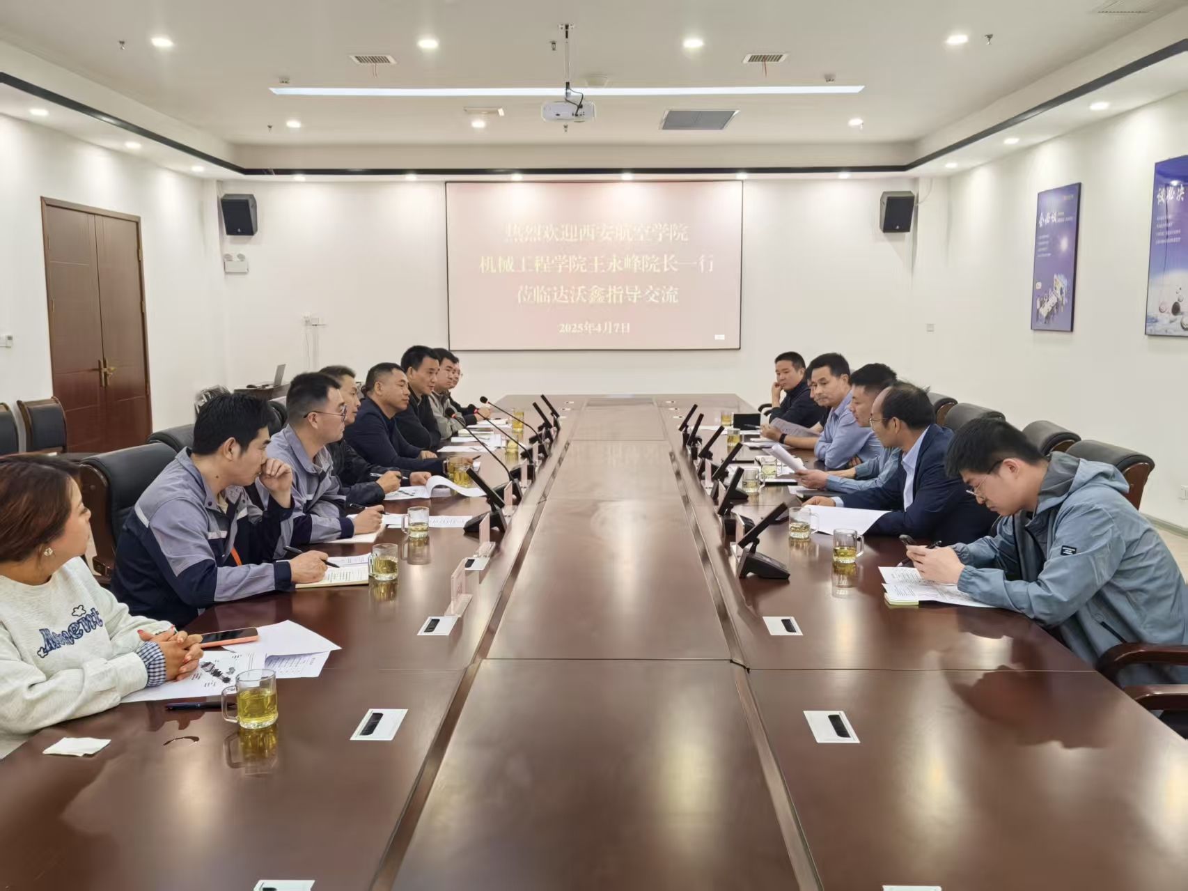 在达沃鑫智能装备有限公司,王永锋一行参观了制造车间,产品展示中心,对企业的生产流程和技术应用有了更直观的认识。之后,与企业技术骨干召开了技术交流会,会议上,王永锋表示学院在智能控制算法、工业机器人应用等关键领域具备显著的技术优势。后续,学院将安排专业教师与企业技术人员进行一对一的对接,通过开展联合科研项目的方式,帮助企业优化现有生产线,提升其柔性化生产能力。会议还对企业实际生产过程中所面临的应用瓶颈展开了深入探讨,并对筹建校企联合研发中心等议题进行了深入交流。