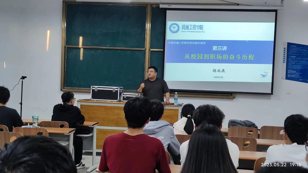 精准服务优才,培育卓越人才。卓越机械工程师培优创新实验班采用虚拟编班形式,学生学籍在行政班级不变,每学期定期开设面向学生需求,邀请校内外专家、优秀校友,开展各类讲座及培训。同时为每位学生一对一配备学业导师,开展项目训练、科学研究、学科竞赛等活动,也随时解决学生急难问题,让优秀的学生走向卓越,榜样引领带动所有的学生走向成功。