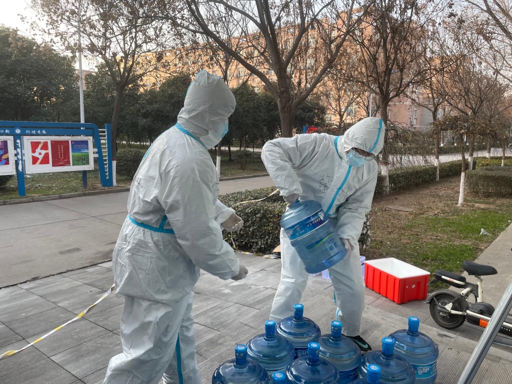学生党员和积极分子主动申请参与志愿者服务工作,累计达123人。每天几千份盒饭、几百桶桶装水和成箱的生活物资仅靠志愿者们一层层爬楼送达。他们肩扛手抬,上下奔波,几个来回下来累的不能走动,大部分志愿者都是连续奋战,毫无怨言。除了生活物资的运送,每日的厕所消杀和垃圾运送任务艰巨,志愿者们克服困难,承担着被感染的风险,不怕脏和苦,默默地工作着。穿梭在楼间的“大白”给了同学们希望和温暖,鼓励着彼此不再害怕和担忧。