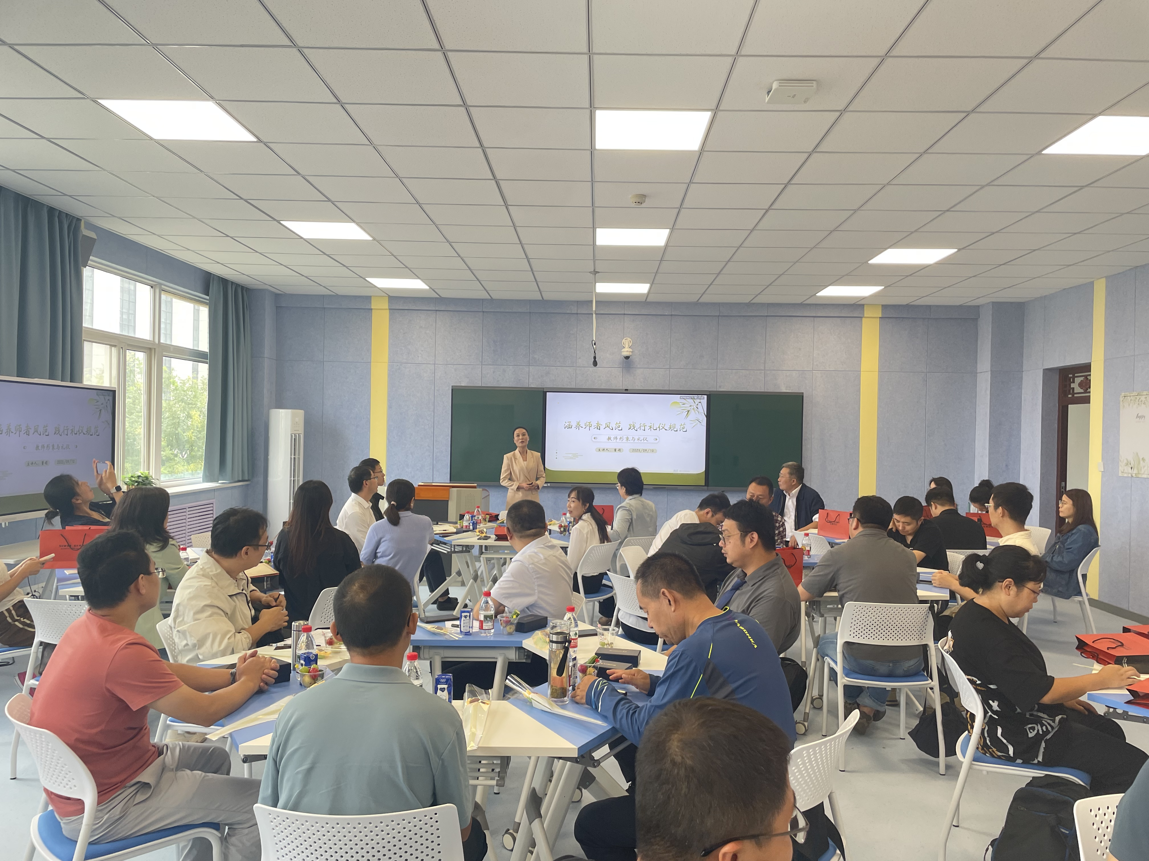 为塑造良好的教师职业形象,助力学校70周年校庆的成功举办,全方位迎接审核评估与硕士学位点建设,2025年9月10日上午,beat365英国官网网站分会在阎良校区3号实验楼3316智慧教室隆重举办教师职业形象提升专题讲座。本次讲座特邀资深礼仪培训师董娟担任主讲,学院全体教职工80余人参加聆听学习。