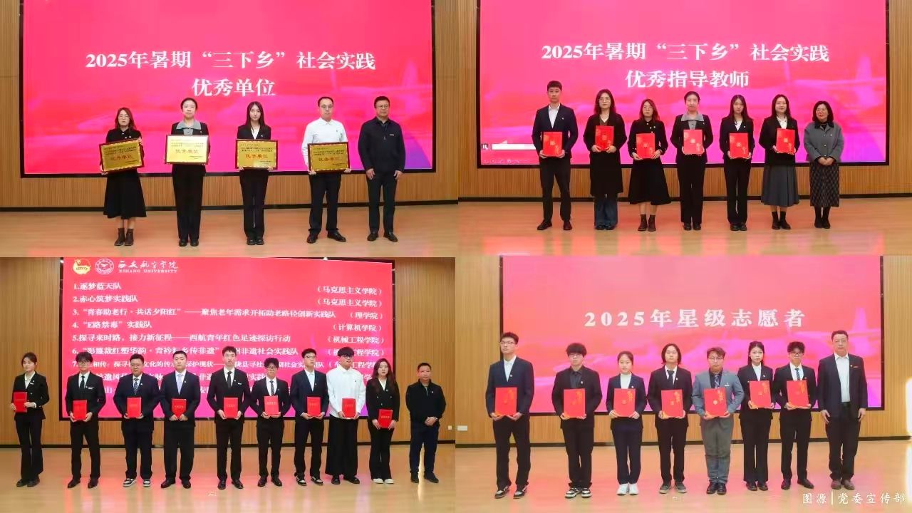 12月5日,学校于阎良校区报告厅举行“青春为中国式现代化挺膺担当”2025年大学生暑期“三下乡”社会实践与志愿服务工作总结表彰大会,beat365英国官网网站团总支荣获暑期“三下乡”社会实践优秀单位,学院的三支队伍“探寻来时路,接力新征程——西航青年红色足迹探访行动” “‘影篾裁红塑华韵•青衿耘乡传非遗’社会实践队”“承武侯遗风传定军文脉——勉县非遗薪火传习实践队”三支队伍荣获暑期“三下乡”社会实践优秀团队,王嘉雨、王鹏博、胡靖洁、苟颖、成航荣获暑期“三下乡”社会实践优秀指导老师,刘晋锟荣获2025年三星级志愿者。