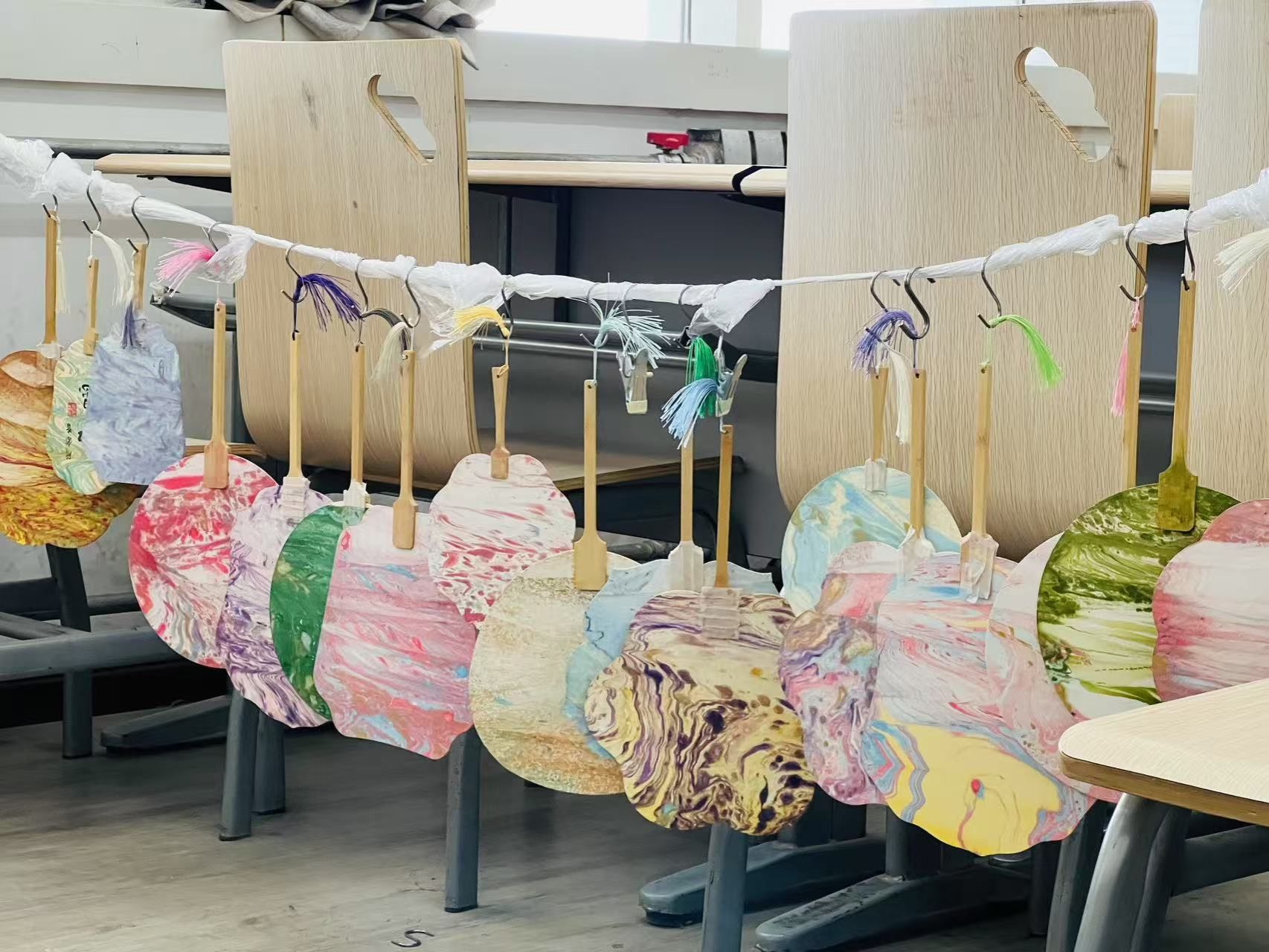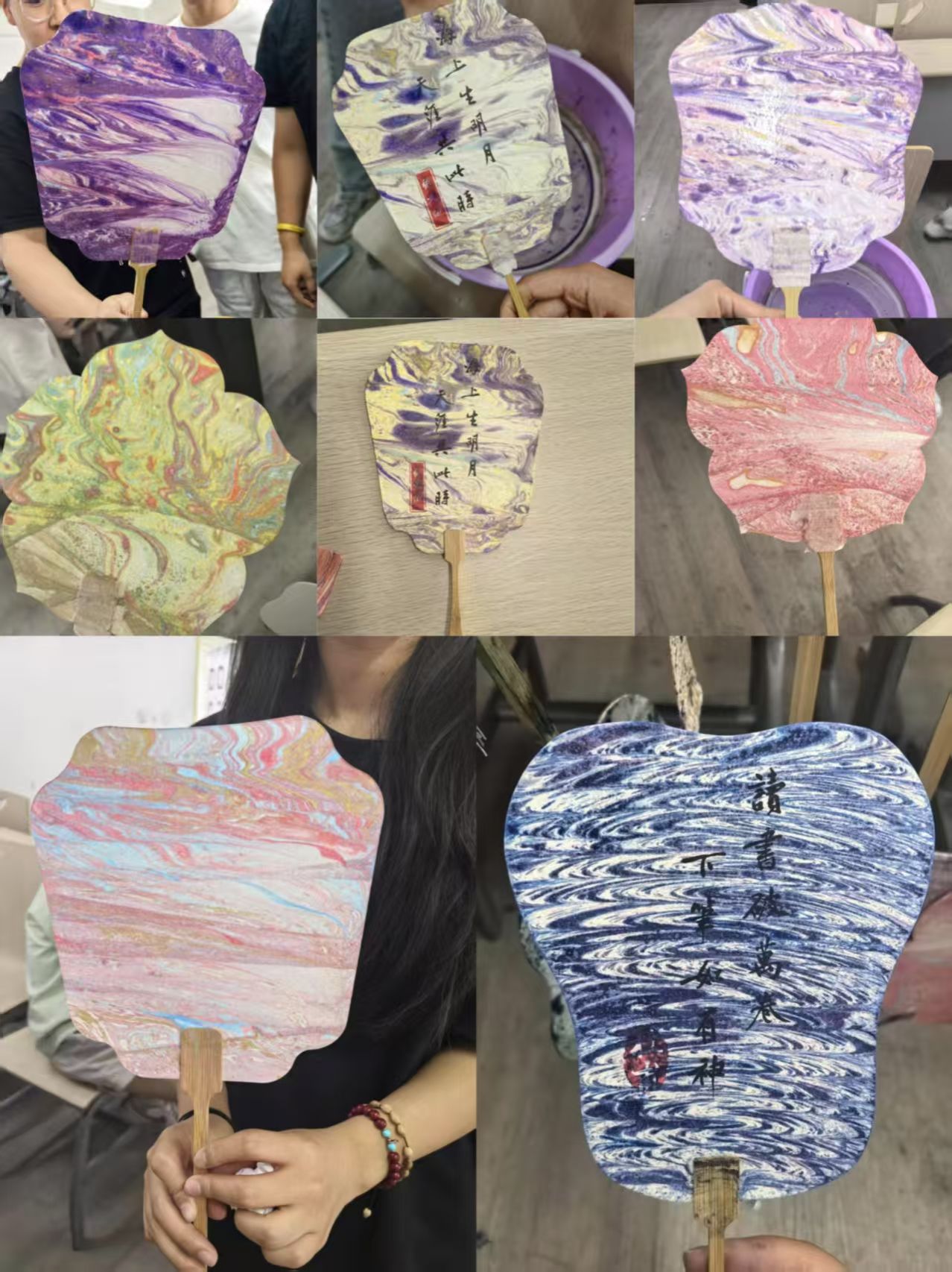 同学们选择好心仪形状的扇子后,认真地调配着漆扇的颜色,充分发挥自己的想象力和创造力。在创作过程中,同学们互相交流、互相学习。有人遇到了困难,旁边的同学会主动帮忙;有人有了新的创意,也会毫无保留地分享给大家,整个活动现场充满了浓厚的艺术氛围。