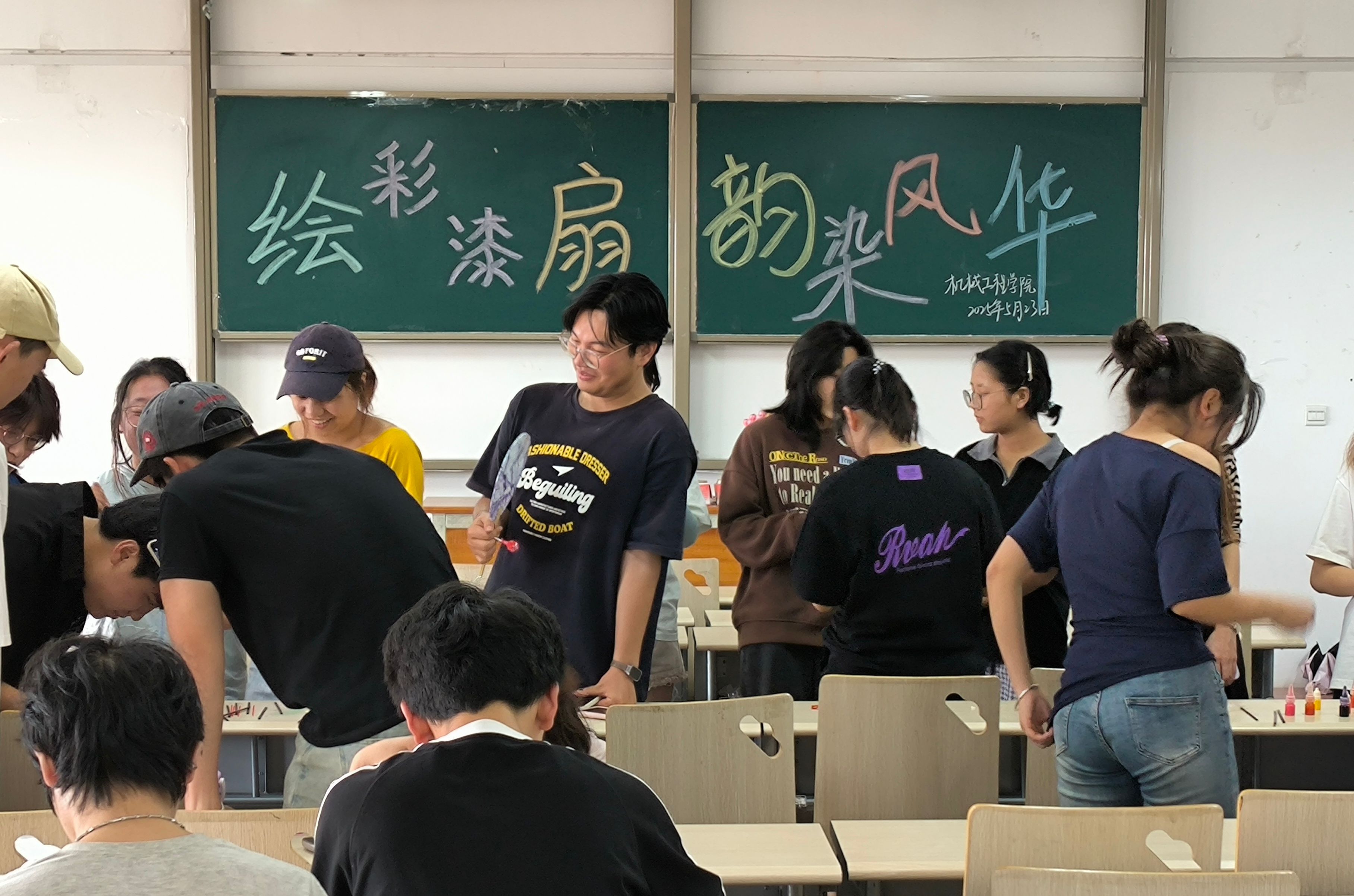 5月23日,一场充满文化韵味的绘彩漆扇活动在阎教楼1422热烈开展。此次活动以“绘彩漆扇,韵染风华”为主题,吸引了众多学生积极参与,院领导和教师们也一同加入,与同学们携手在漆扇上挥洒创意,共同体验漆扇绘彩的独特魅力。