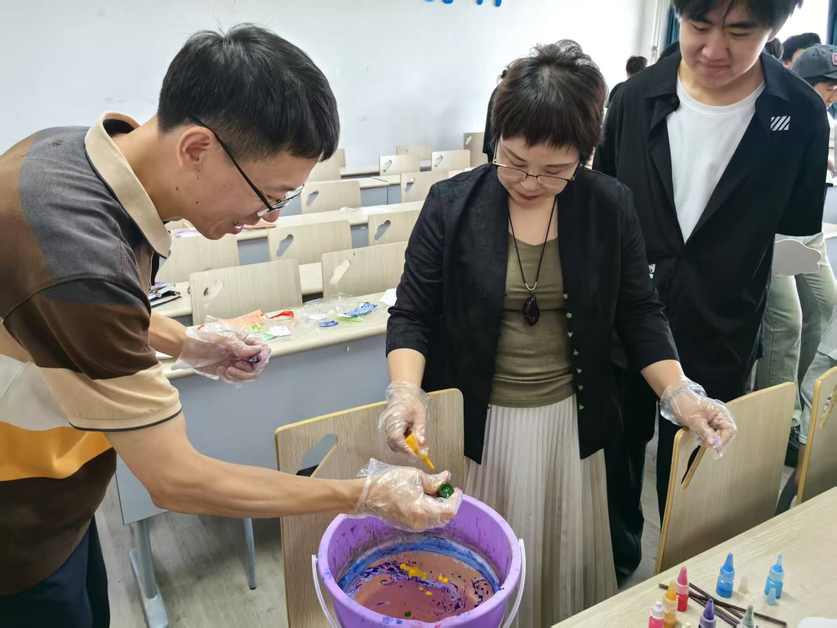 beat365官网孙书记和刘书记也加入到了创作的队伍中,他们拿起漆瓶,往桶中滴入各色大漆,搅拌出想要的图案,最终制作出色彩绚丽的漆扇。beat365官网辅导员胡老师也一同参与其中,与学生们一起在扇面上染出美丽的图案。